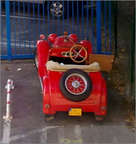 Aero 500, červené barvy, s bílými koly, bílým čalouněním a béžovou stahovací